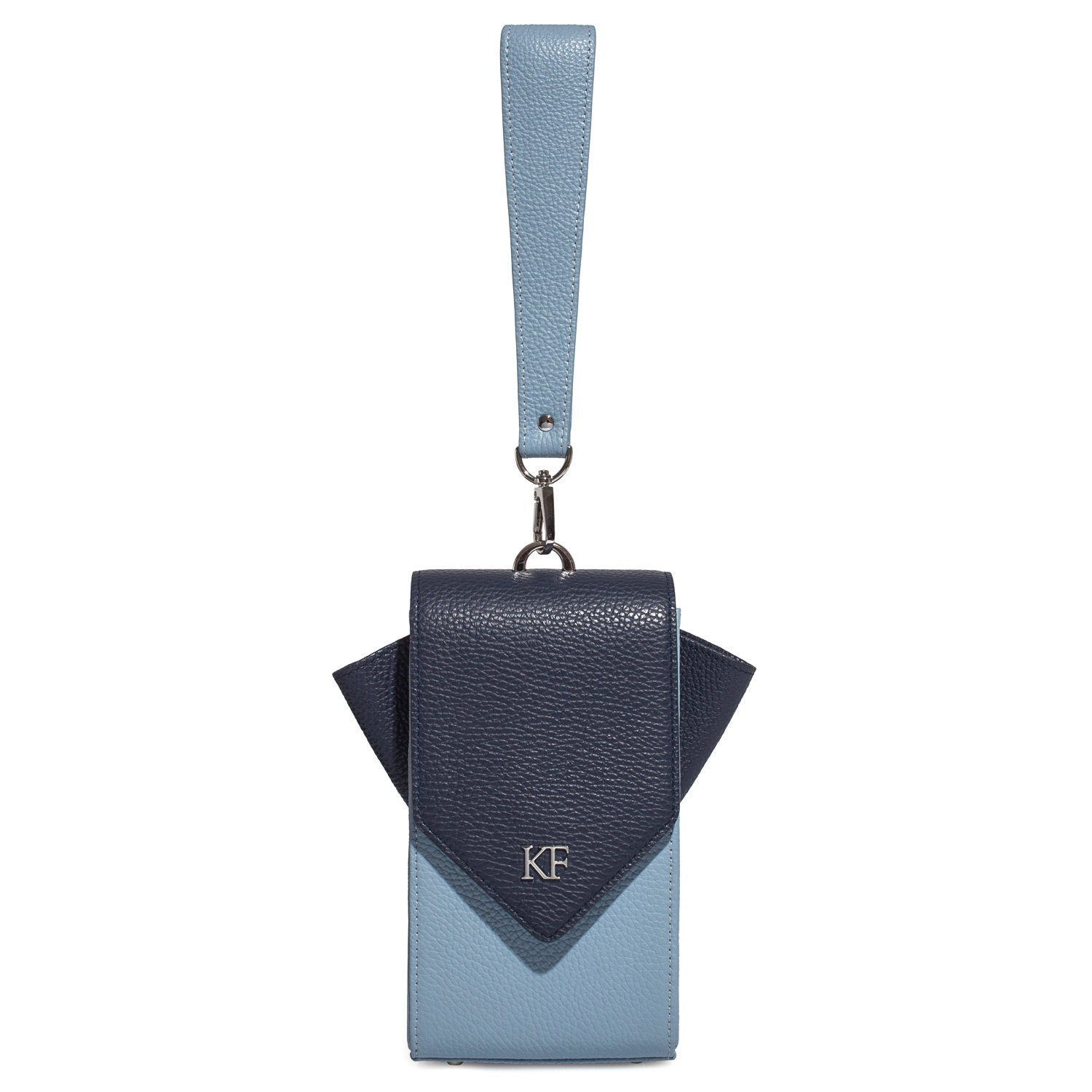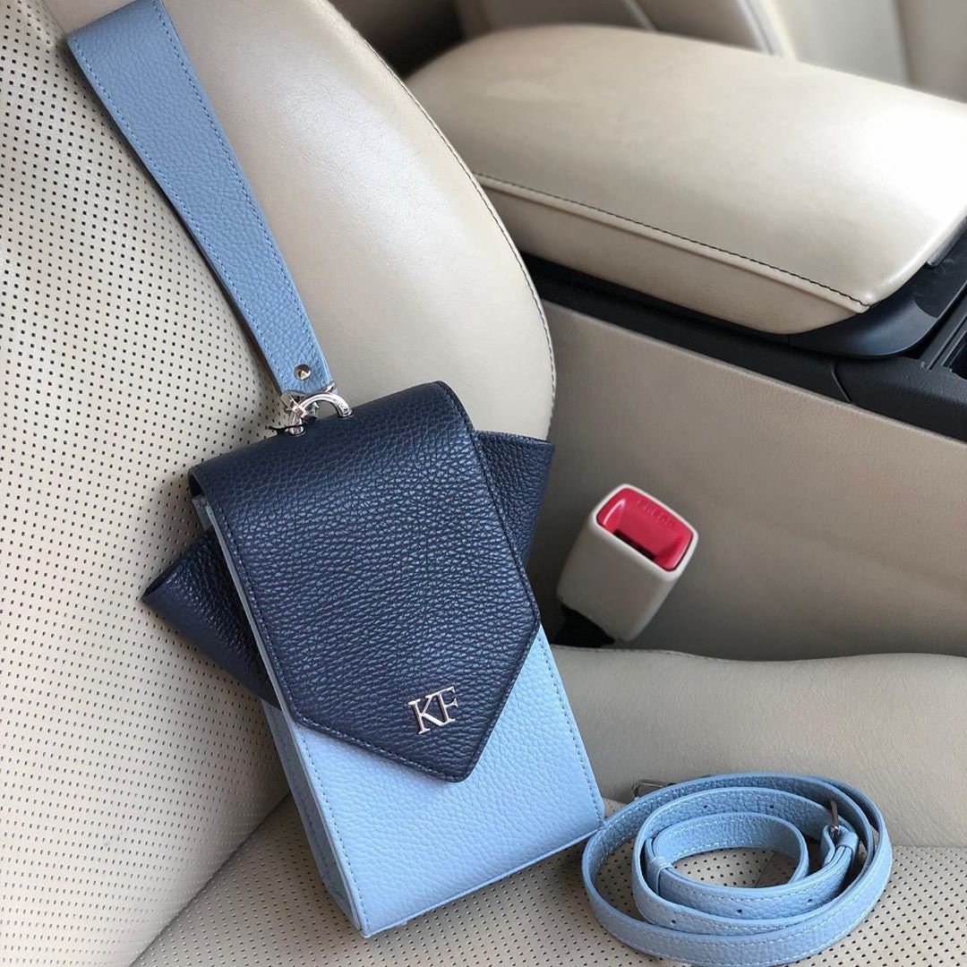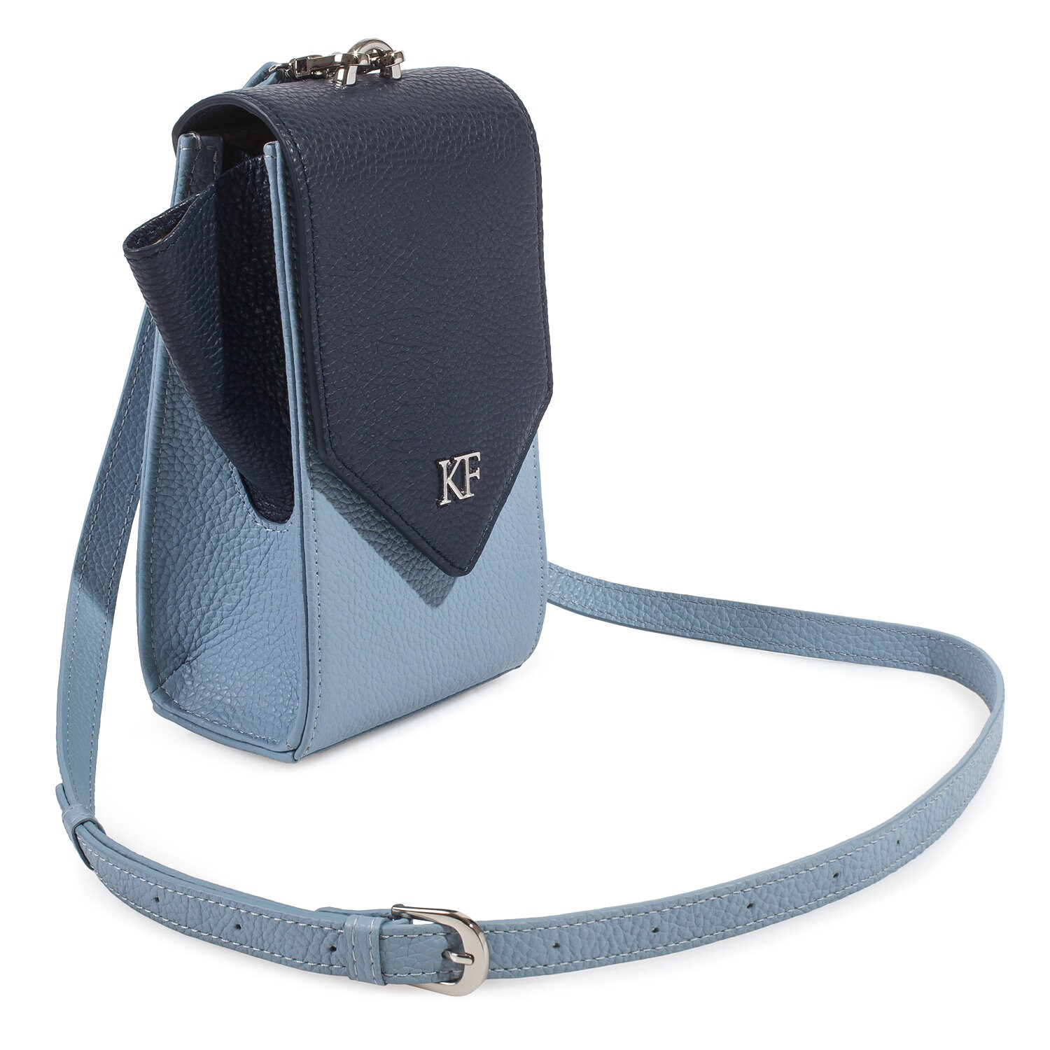 Blue genuine leather woman crossbody bag from ukrainian designer Katerina Fox. Fashionable and elegant modern bag KF for bright girls and women. This bag is able to attract attention and highlight your exquisite taste. All accessories for Katerina Fox bags makes the same factory as for Michael §¬ors, Calvin Klein, DKNY and other famous brands.The internal space of a bag is equipped with one spacious compartment, four patch pockets for cards. The bag is closed on the button-magnet. The bag has a short removable handle on wrist.The length of the strap is adjustable. The kit also includes a storage bag.