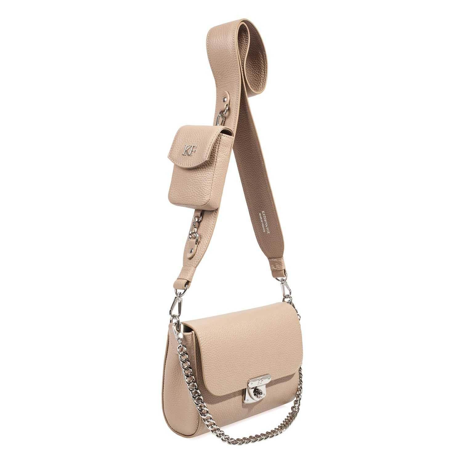 Beige genuine leather woman shoulder bag from Ukrainian designer Katerina Fox. Fashionable and elegant modern bag KF for bright girls and women. This bag is able to attract attention and highlight your exquisite taste. Inside the bag is one large compartment and a convenient zippered pocket for small items, closes the bag on the clasp. The bag is comfortable to wear on the shoulder or across the shoulder.