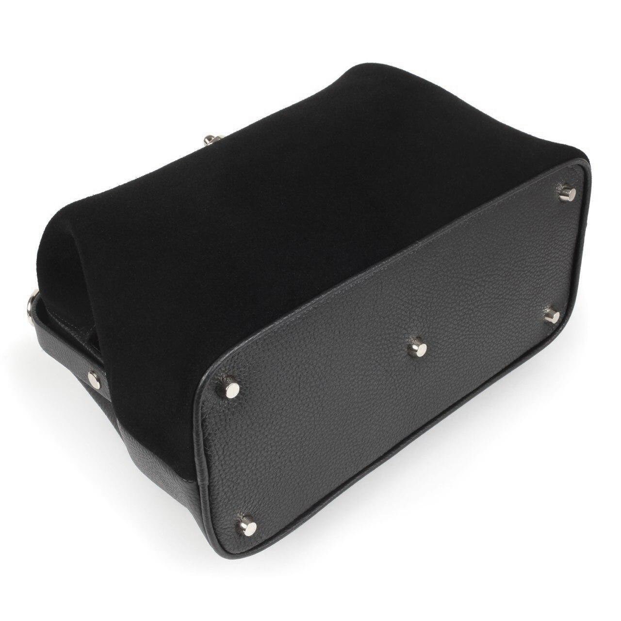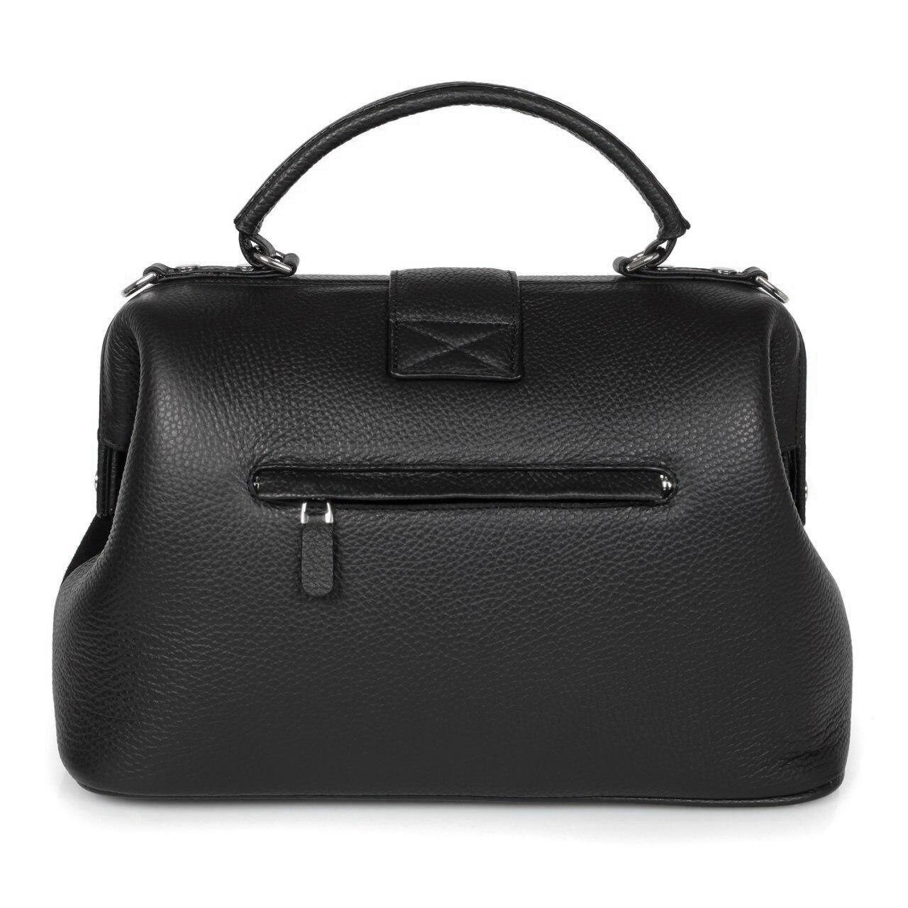 Black genuine leather handbag from ukrainian designer Katerina Fox. This model is designed for women who appreciate the sleek design combined with functionality and comfort. High-quality and reliable hardware ensure long service bags. The internal space of a bag is equipped with one spacious compartment and two patch-pockets and one zipper pocket. The bag is closed with a clasp. The bottom of the bag is protected with metal legs. There is a long handle that allows you to wear the bag on the shoulder. The kit also includes a storage bag.