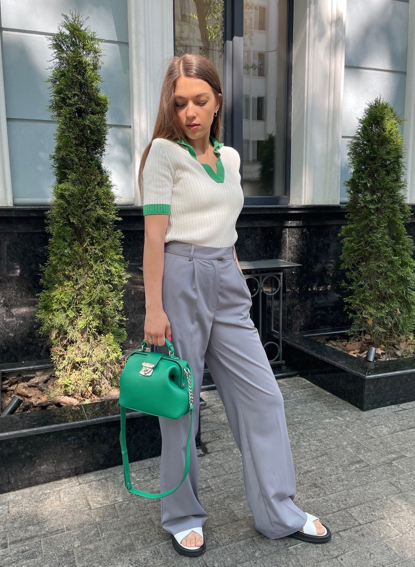 Green genuine leather handbag from ukrainian designer Katerina Fox. This model is designed for women who appreciate the sleek design combined with functionality and comfort. High-quality and reliable hardware ensure long service bags. The internal space of a bag is equipped with one spacious compartment and one patch-pocket and one zipper pocket. The bag is closed with a clasp. The bottom of the bag is protected with metal legs. There is a long handle that allows you to wear the bag on the shoulder. The kit also includes a storage bag.