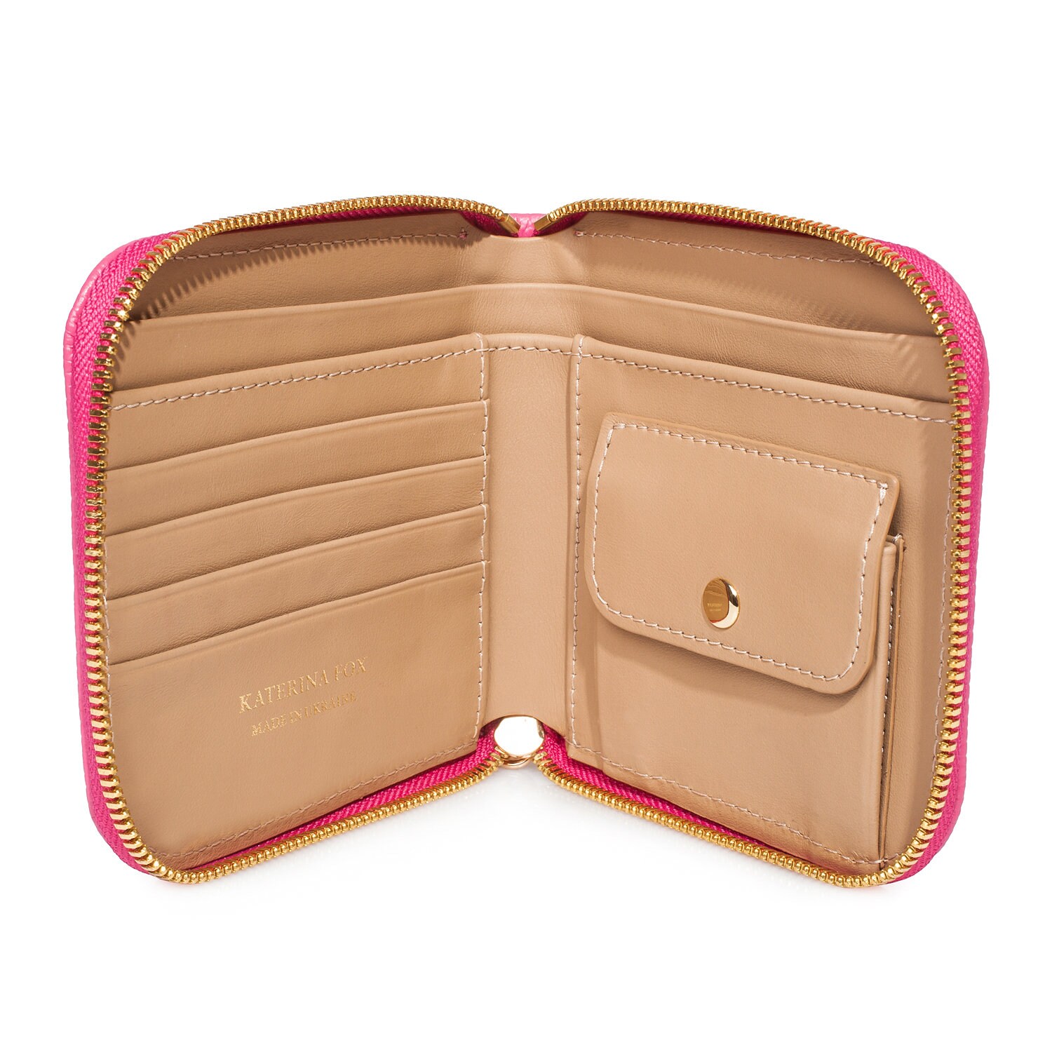 Fuchsia genuine leather woman wallet from ukrainian designer Katerina Fox. A stylish accessory – a necessary purchase for many women. Wallet KF like women who value practicality and beauty. The internal space of a wallet is equipped with two large compartments for banknotes, a pocket for coins and four business card compartments and two auxiliary compartments. The wallet is closed with a zipper. The kit also includes a storage bag.