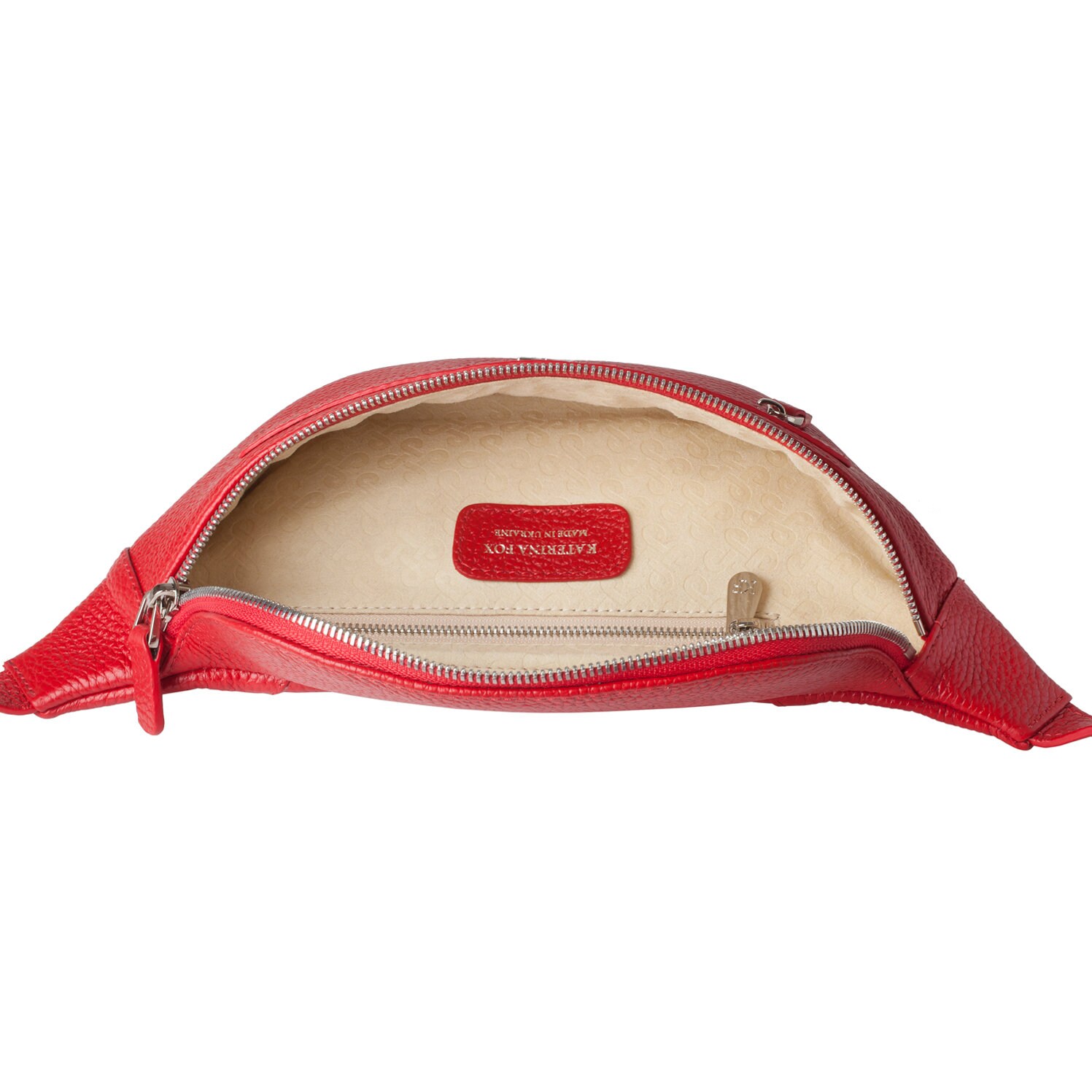 Red genuine leather woman bananka bag from ukrainian designer Katerina Fox. Fashionable and elegant modern bag KF for bright girls and women. This bag is able to attract attention and highlight your exquisite taste. Inside the bag is one large compartment and a convenient zippered pocket for small items, closes the bag on the zipper.