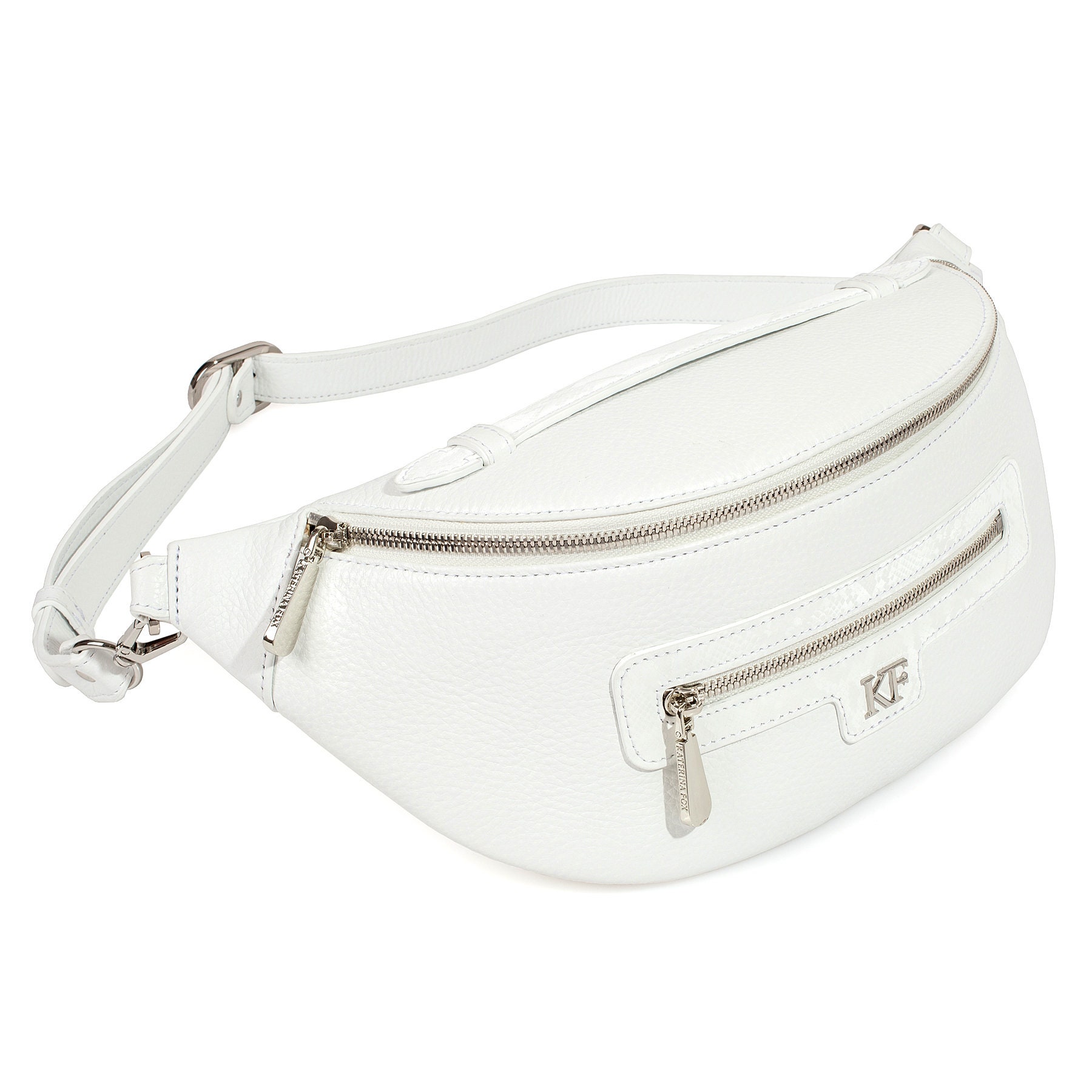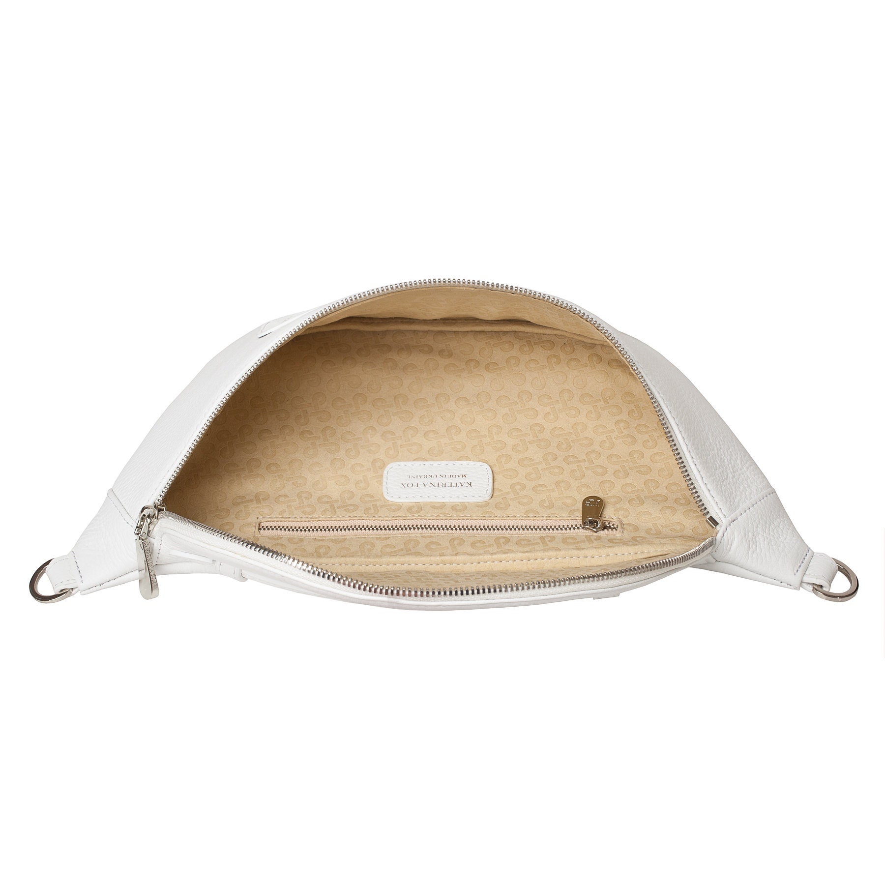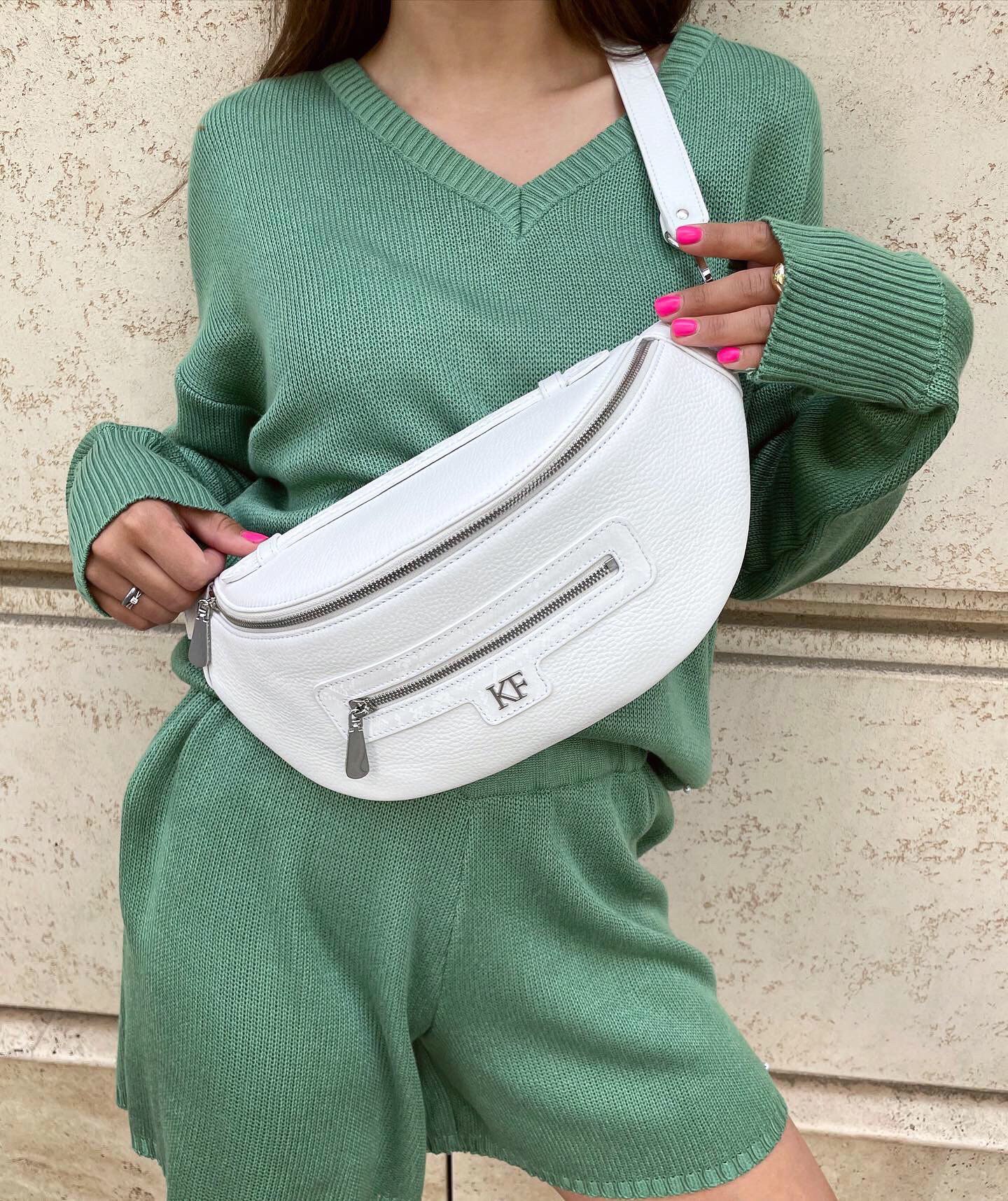 White genuine leather woman banana bag from Ukrainian designer Katerina Fox. Fashionable and elegant modern bag KF for bright girls and women. This bag is able to attract attention and highlight your exquisite taste. Inside the bag is one large compartment and a convenient zippered pocket for small items that closes the bag on the zipper.