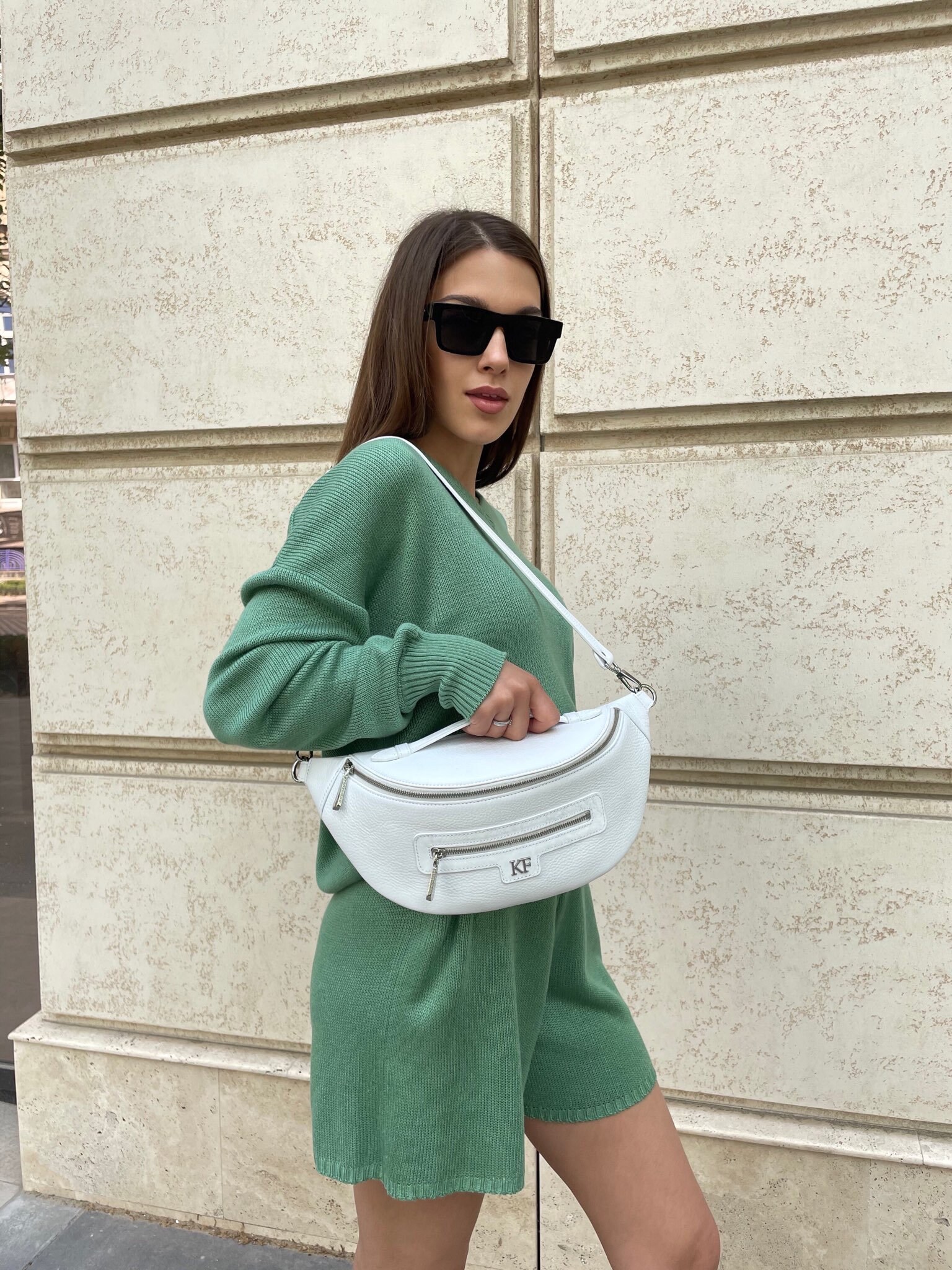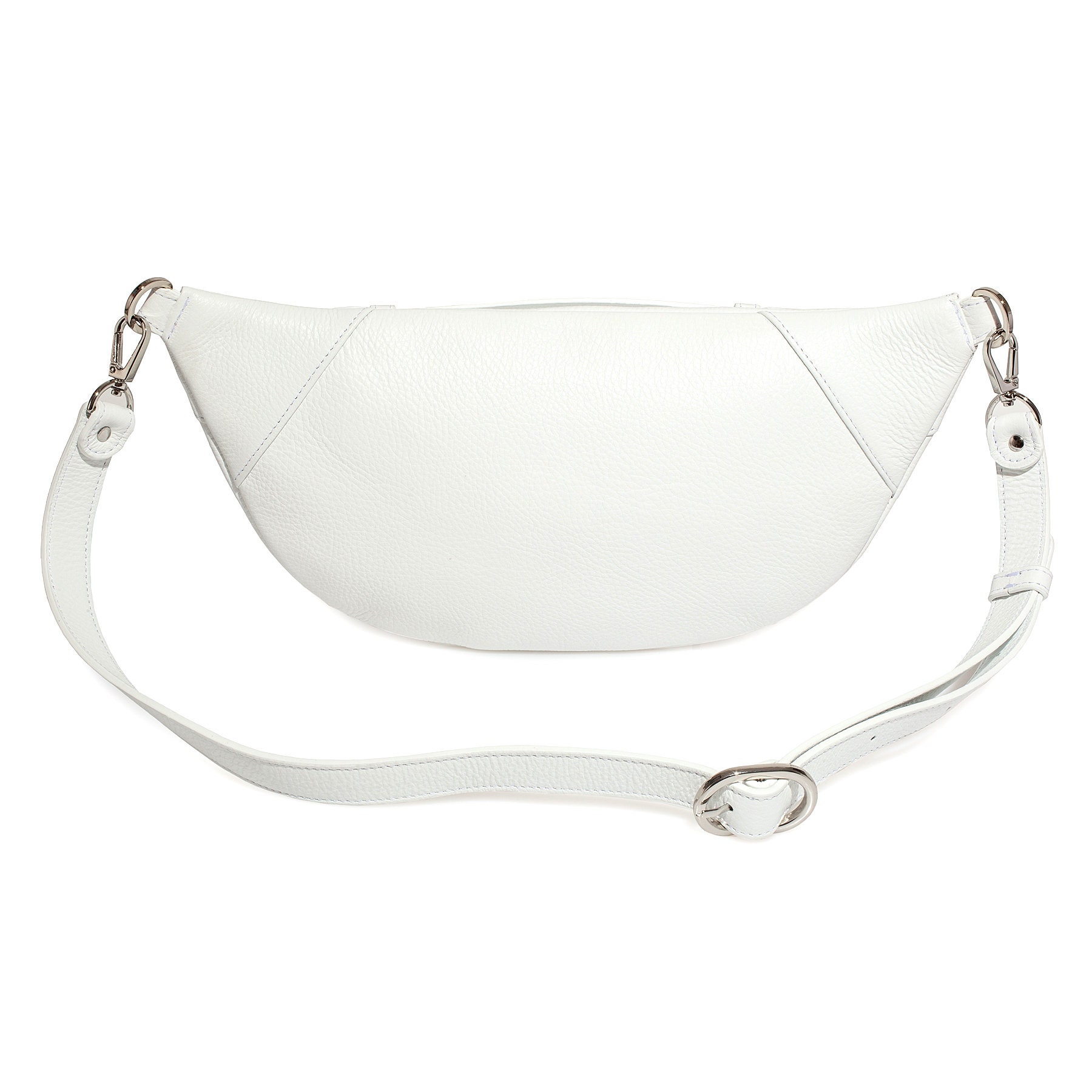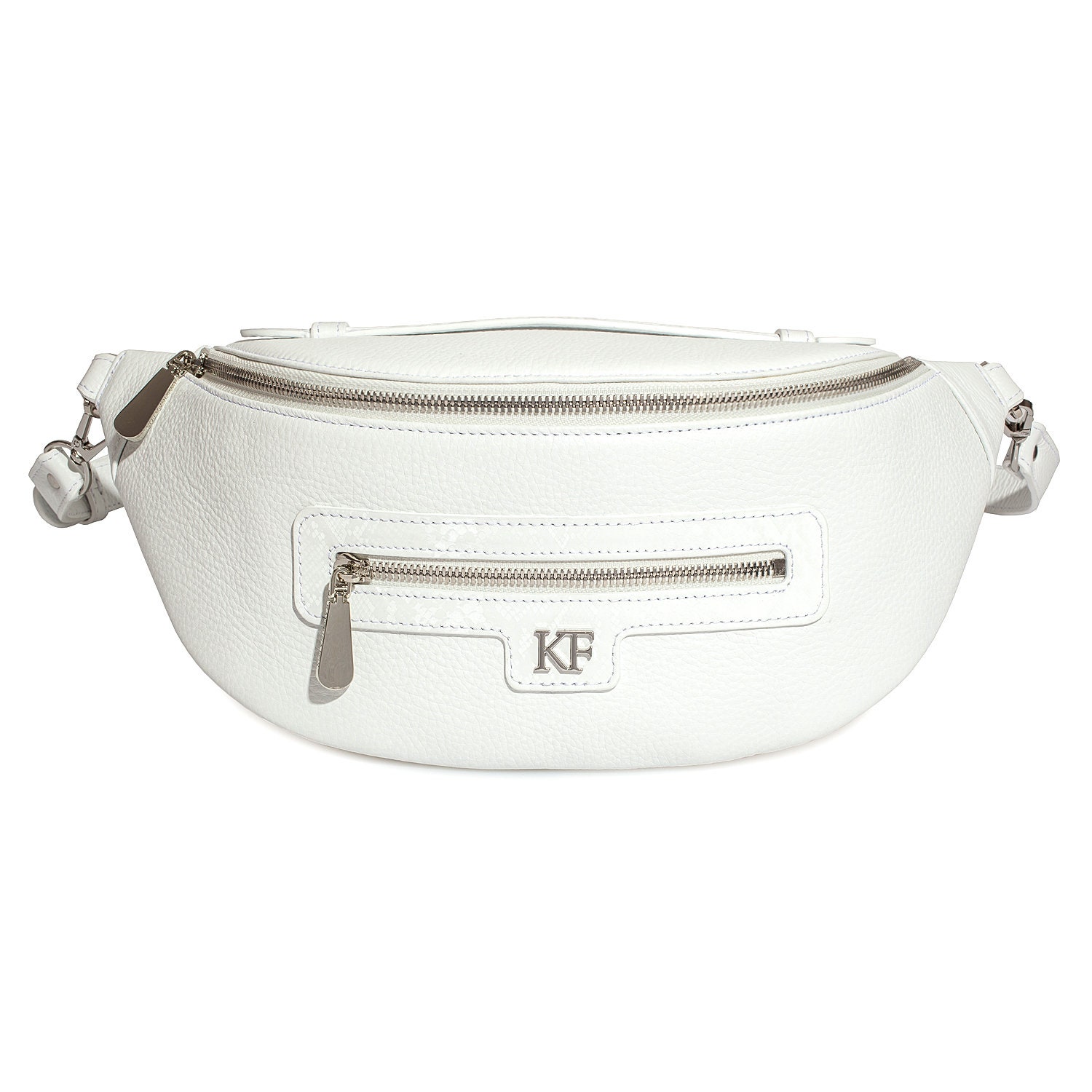 White genuine leather woman banana bag from Ukrainian designer Katerina Fox. Fashionable and elegant modern bag KF for bright girls and women. This bag is able to attract attention and highlight your exquisite taste. Inside the bag is one large compartment and a convenient zippered pocket for small items that closes the bag on the zipper.